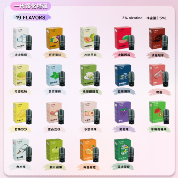 - 煙油成分:甘油、丙二醇、香精、有機尼古丁