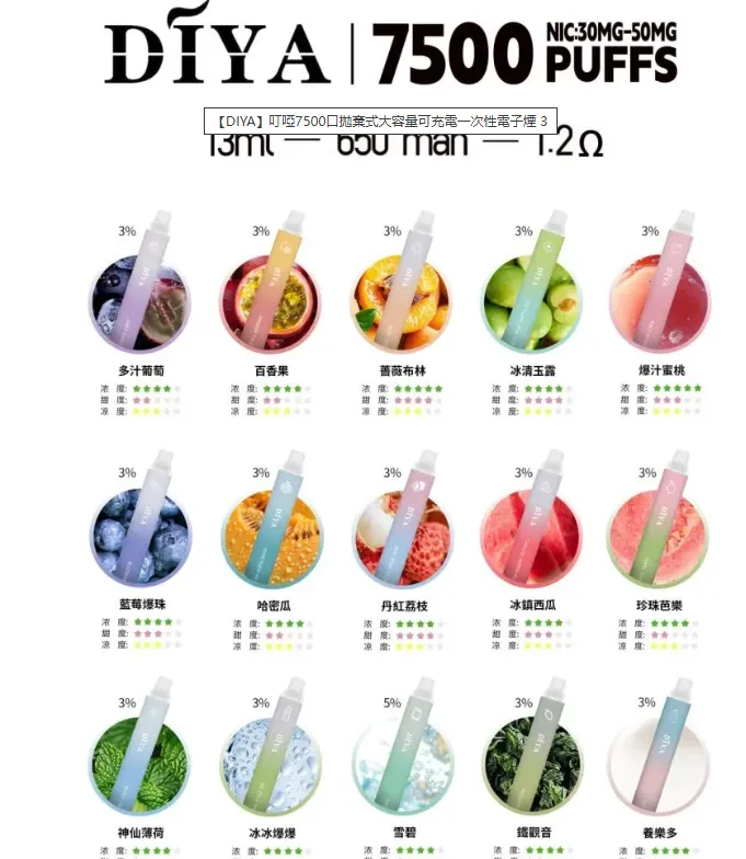 DIYA 叮啞 7500口一次性電子煙提供 多種口味選擇,包括經典煙草、薄荷清爽、水果甜味等,每種口味都經過精心調配,煙霧柔順、香氣純正。例如: